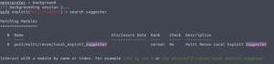 Najpierw przełącz się do konsoli Metasploita wydając polecenie background. Następnie wyszukaj Exploit Suggestera: search suggester: