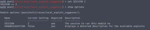 Wskaż Metasploitowi, że chcesz użyć Exploit Suggestera: use 0. Exploit Suggester jako parametr przyjmuje sesję Meterpretera. Należy podać ID sesji Meterpretera. Wypisz wszystkie dostępne sesje komendą sessions. Następnie ustaw ID sesji Meterpretera w Exploit Suggesterze. W moim przypadku było to 2: set session 2: