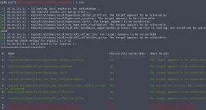 To wszystko. Teraz wystarczy uruchomić wyszukiwanie podatności za pomocą polecenia run. Exploit Suggester wypisze podatności, które zostały sprawdzone. Dodatkowo zaznaczy na zielono te które mogą zadziałać: