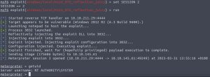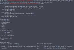Żeby zastosować podatność z listy należy wykorzystać polecenie use i nazwę exploita. Następnie tak jak poprzednio ustawiamy ID sesji Meterpretera. Nie ma 100% pewności, że exploit zadziała. Dlatego trzeba poeksperymentować. Aby uzyskać więcej informacji można użyć polecenia info zaraz po przełączeniu się na konkretny exploit:
